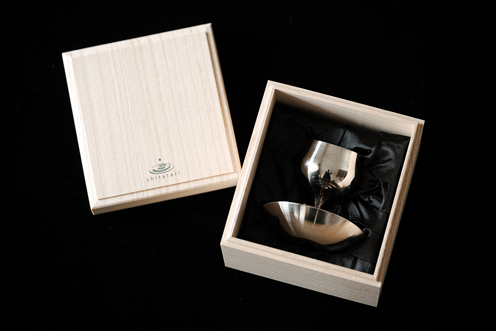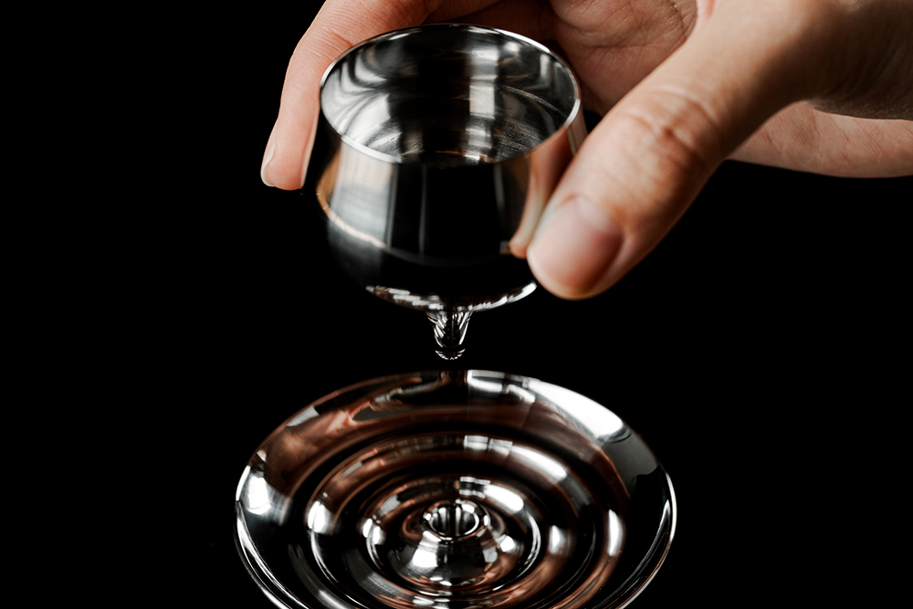 The common gesture of Masu sake can be enjoyed with a different sensation from that of Masu sake. By spilling the sake, you can see the expression of Sake,and when you put “shitatari” on your mouth, you can feel as if you are touching Sake directly.The shape of your mouth when drinking made of stainless steel and cut to the perfect thickness, allowing you to enjoy the taste of sake not only by feel but also by mouthfeel. The design of this “shitatari” are perfectly aligned, and when lifted, each drop of sake drips onto the saucer, creating ripples in the air. When sake is poured, it reflects and sparkles, as if it is asking to be poured as soon as possible.